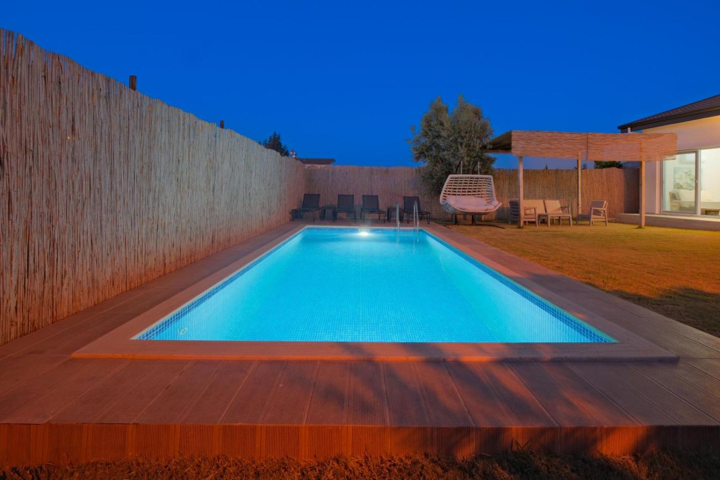 Guests can enjoy the outdoor swimming pool and garden at the villa.